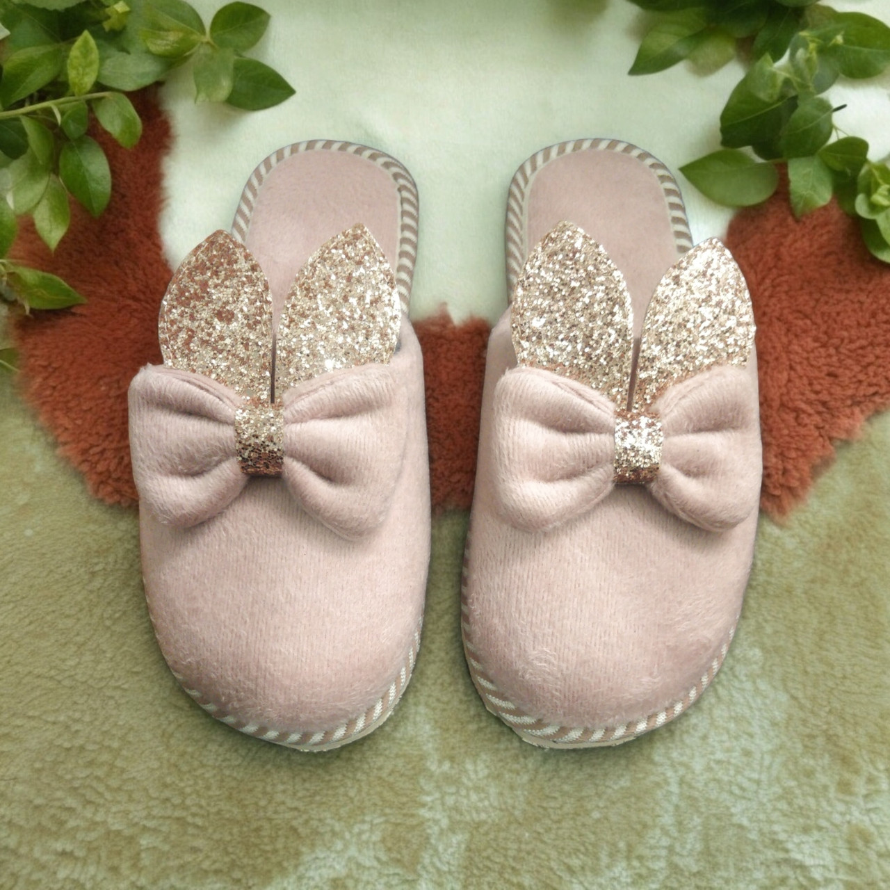 Хатні капці, кімнатні жіночі зайчики з блискучими вушками пудра 42 розмір